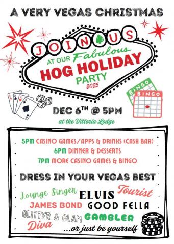 It's that time of year again for our Annual Holiday Party! The best party in Town!! Come celebrate A VERY VEGAS CHRISTMAS with us! 5:00pm Casino Games with Apps & Drinks (cash bar) 6:00pm Dinner and Desserts 7:00pm More Casino Games and Bingo officiated by Rhonda Add to the fun and DRESS IN YOUR VEGAS BEST to this event -- prizes awarded for the best dressed. Think -- lounge singer, Elvis, tourist, James Bond, Goodfella, gambler, diva, glitter & glam... or just be yourself. Please pay at the November chapter meeting. If you cannot attend the meeting, please RSVP via HOGscan & pay at the door. RSVP by 11/24/25.