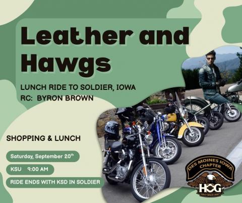We will be taking a scenic ride to Soldier, Iowa to stop in at Leather and Hawgs for some shopping and then lunch at Midway Tavern.  This scenic tour 2 hours (approximate) ride will end with KSD in Soldier.  Byron has planned, pre-rode the route with one stop to stretch legs and other things.  Byron will be earning is Road Captain patch today and we  look forward to joining him on many more future rides.